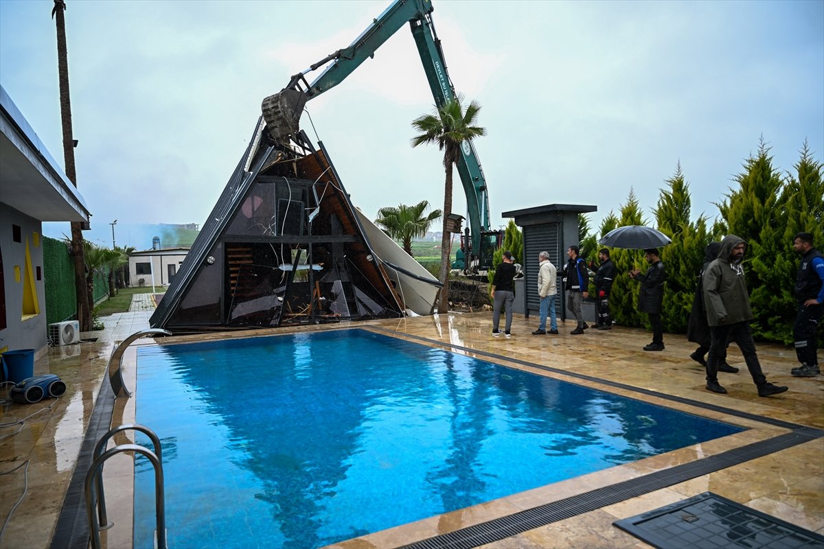 Devlet Su İşleri, Büyükşehir Belediyesi ve Sarıçam Belediyesi ekiplerince iş makineleriyle yıkılan yapıların kalıntıları, kamyonlarla bölgeden uzaklaştırılıyor.
