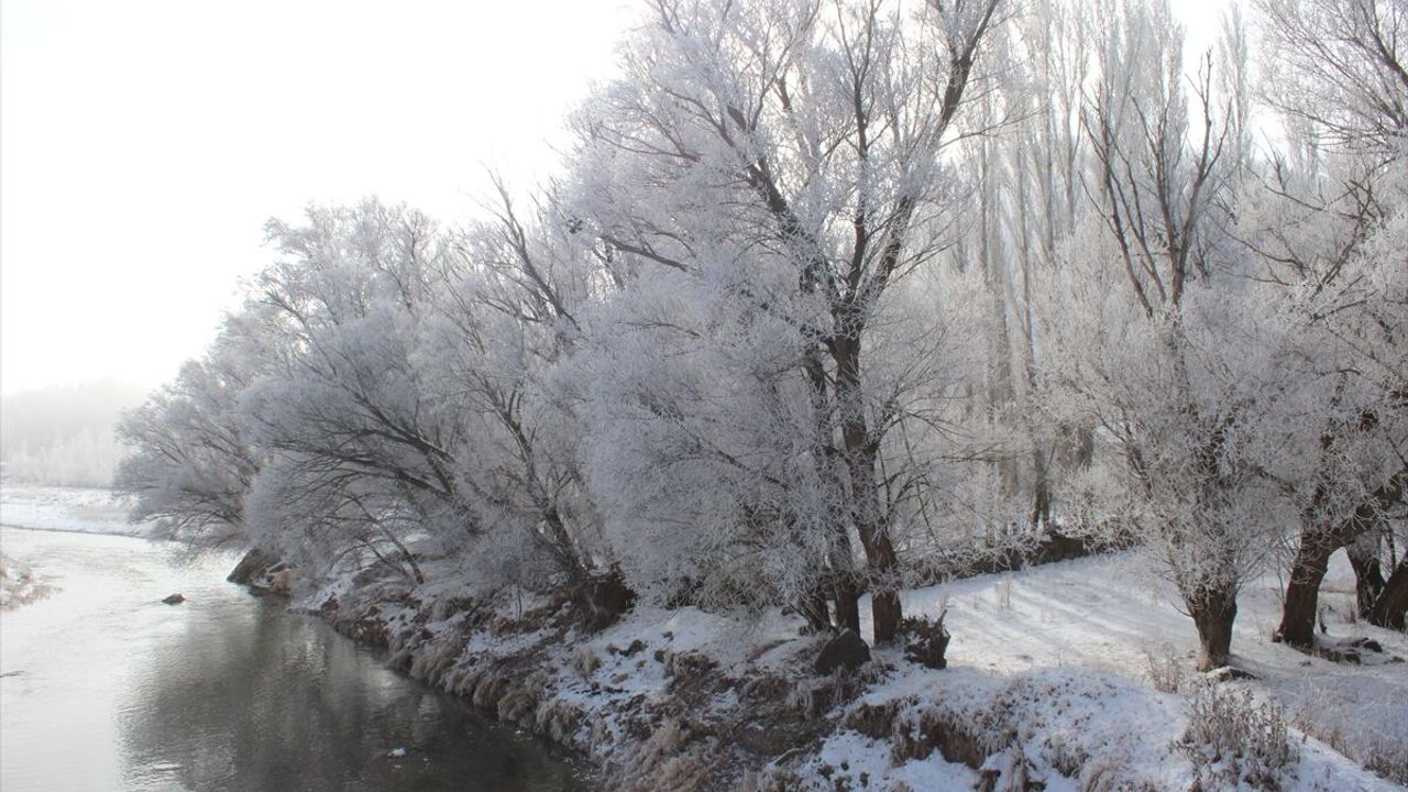 AĞRI (AA) - Ağrı'nın Taşlıçay ilçesinde soğuk havanın etkisiyle kırağı tutan ağaçlar, güzel manzara oluşturdu.