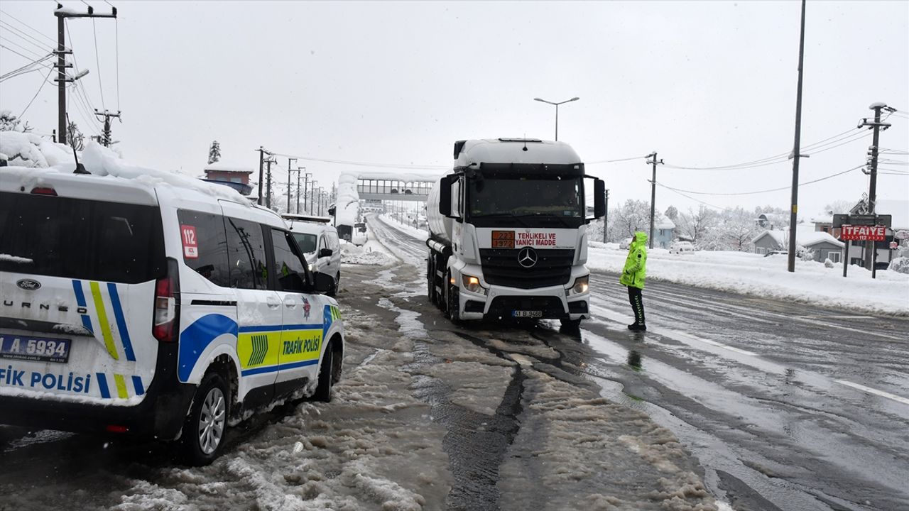 Kara yolunun her iki istikametinde de yoğun kar yağışı ve buzlanma nedeniyle ağır tonajlı araçların geçişine müsade edilmiyor.