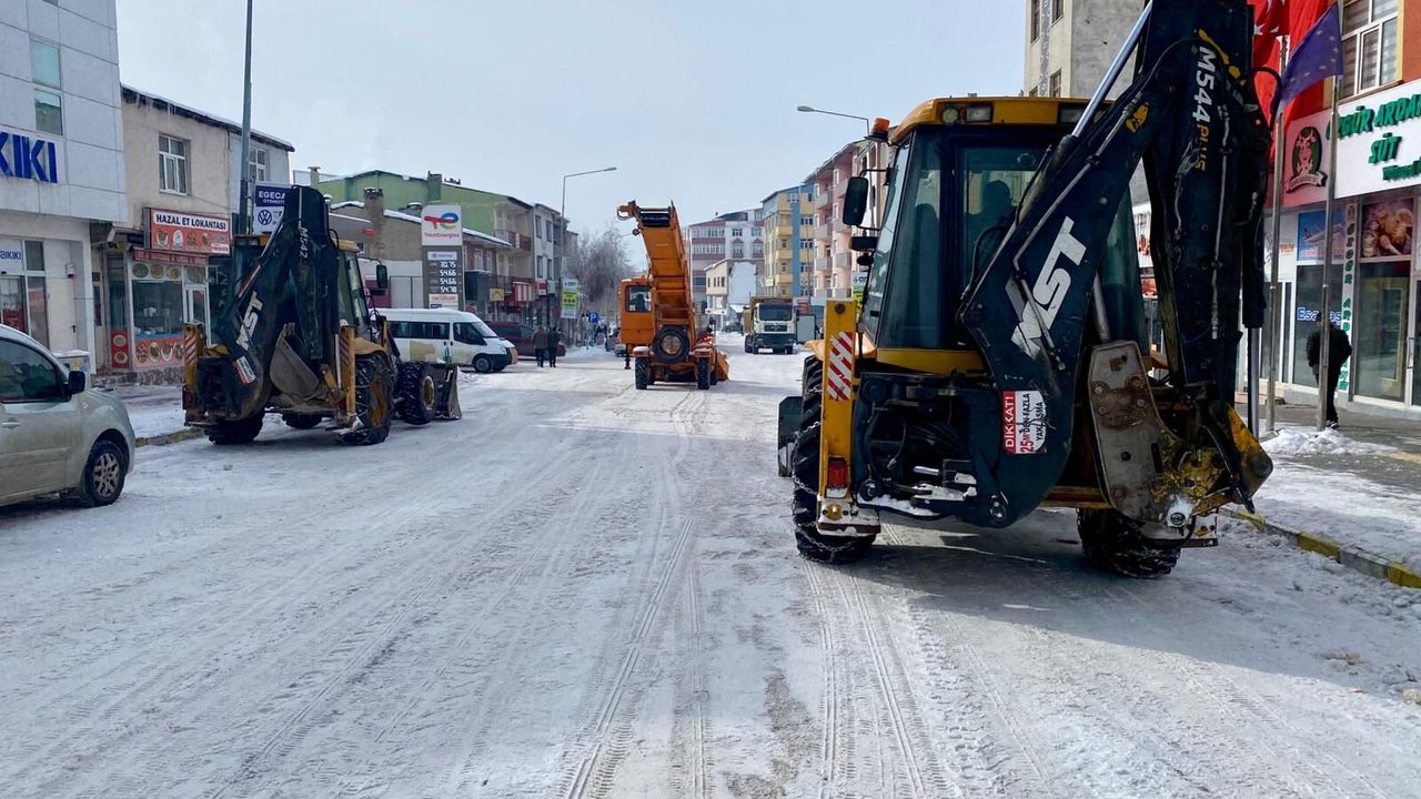 Olumsuz hava koşulları nedeniyle cadde ve sokaklarda oluşan buz ve kar kütleleri için belediye ekiplerince temizlik çalışması başlatıldı.