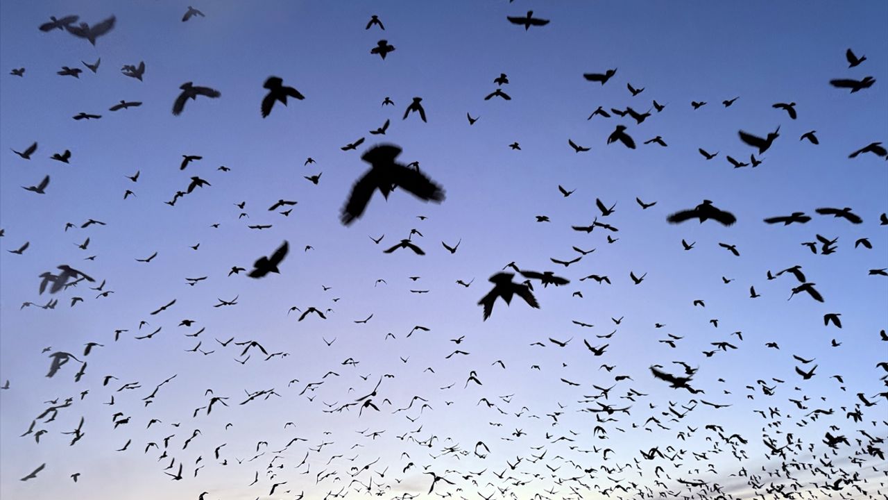 Akşam saatlerinde gün batımı sırasında kent merkezi semalarında çok sayıda kuş toplandı.