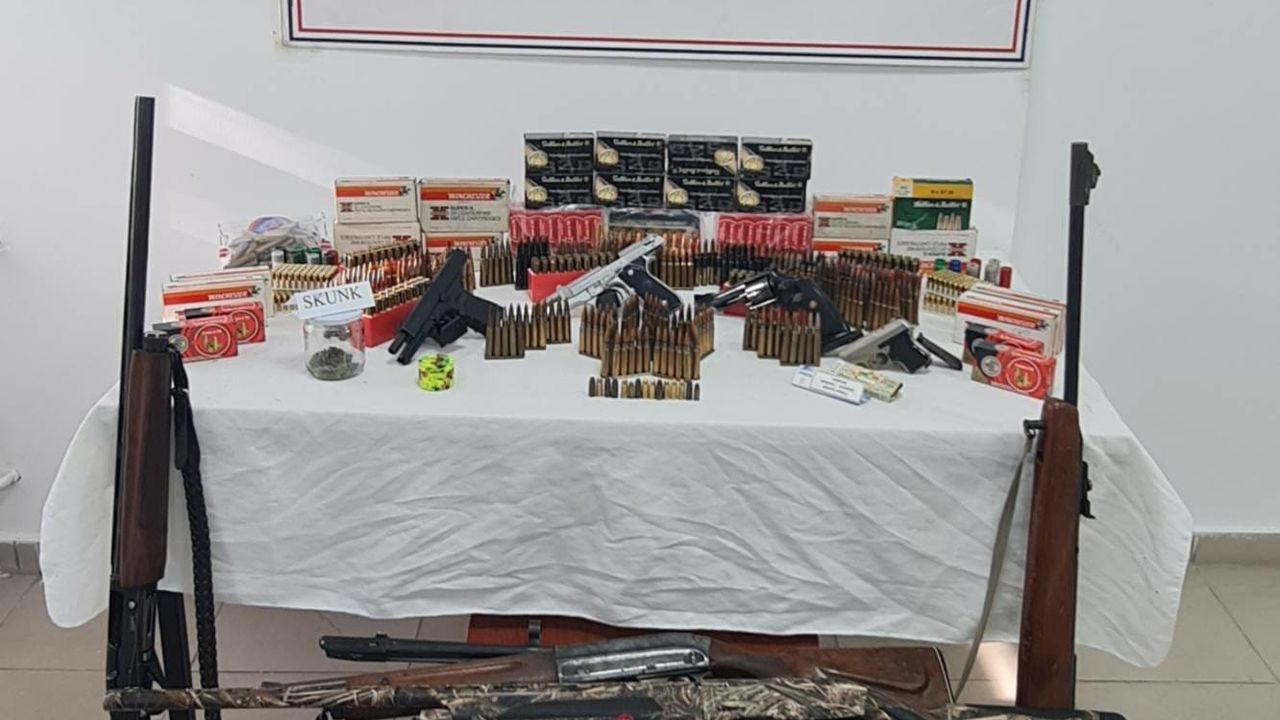 Bir istihbaratı değerlendiren İl Jandarma Komutanlığı ekiplerince, ilçedeki 3 adrese eş zamanlı gerçekleştirilen operasyonda, 4 tabanca, 3 av tüfeği, havalı tüfek, çeşitli çaplarda 2 bin 104 fişek ve 4 şarjör ile bir miktar sentetik uyuşturucu ele geçirildi.