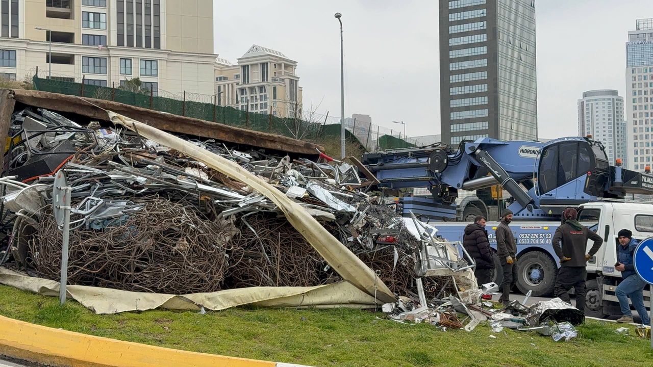 İSTANBUL (AA) - Ataşehir'de devrilen hurda yüklü kamyon ulaşımın aksamasına neden oldu.