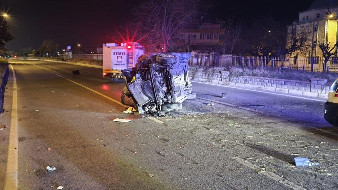 Çarpışmanın şiddetiyle savrulan hafif ticari araç refüje çarparak devrildi.