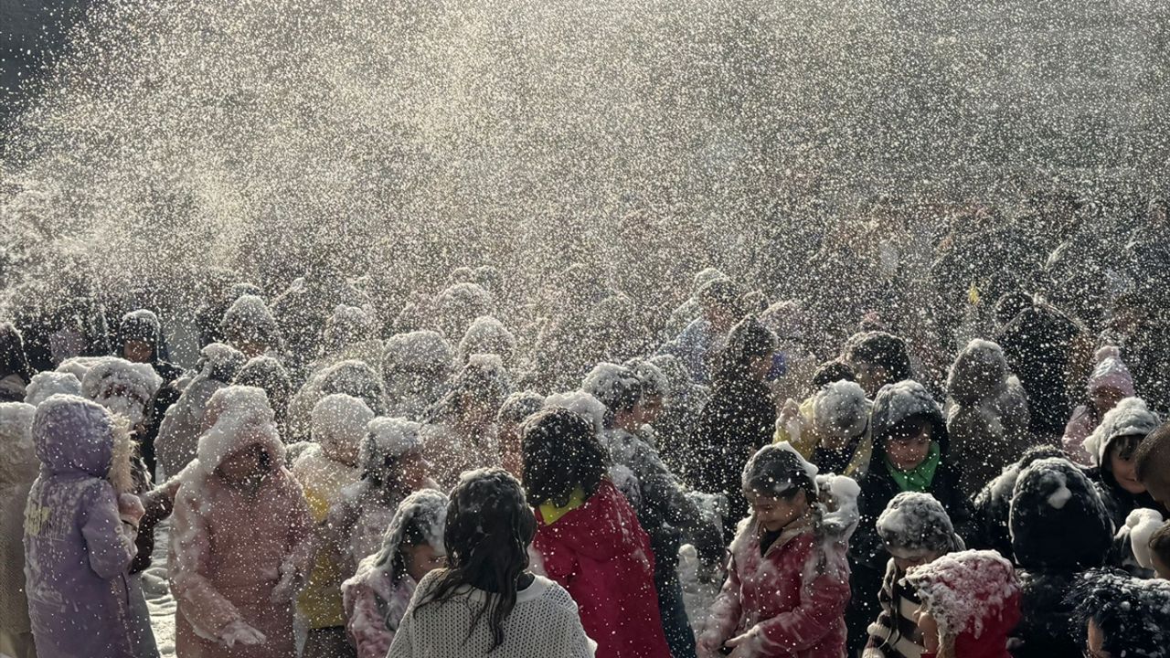 Karnelerin dağıtılmasının ardından okul bahçesinde köpük püskürtme makinesiyle havaya köpük sıkıldı.
