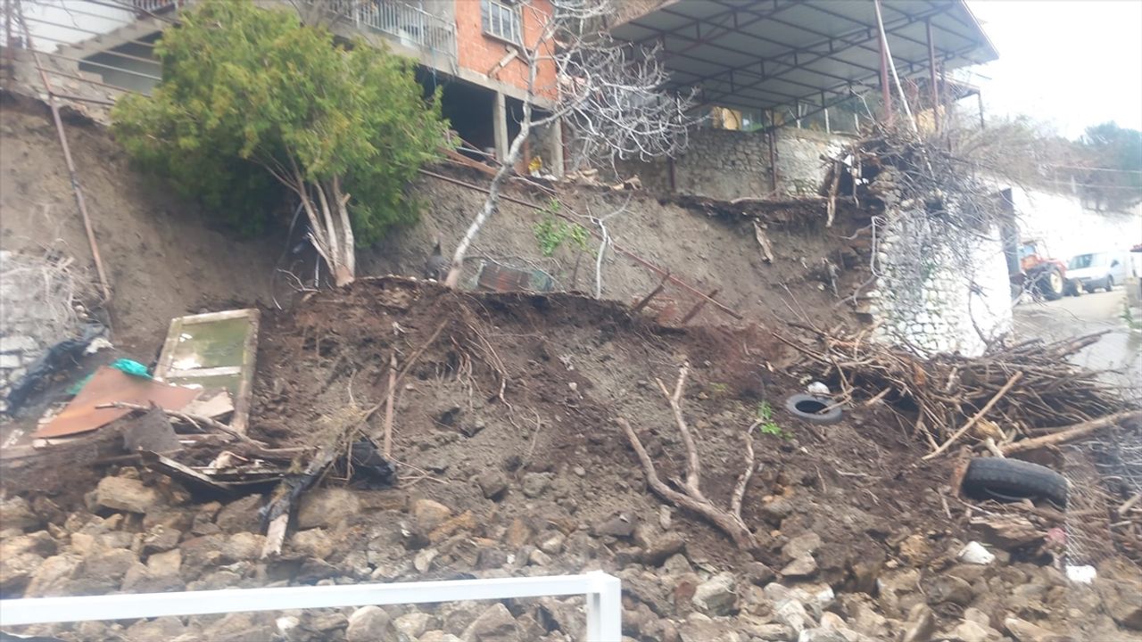 Bozdoğan ilçesi Hisar Mahallesi Değirmen Sokak'ta S.A'ya ait evin bahçe duvarı, sağanağın ardından toprak kayması sonucu yıkıldı.
