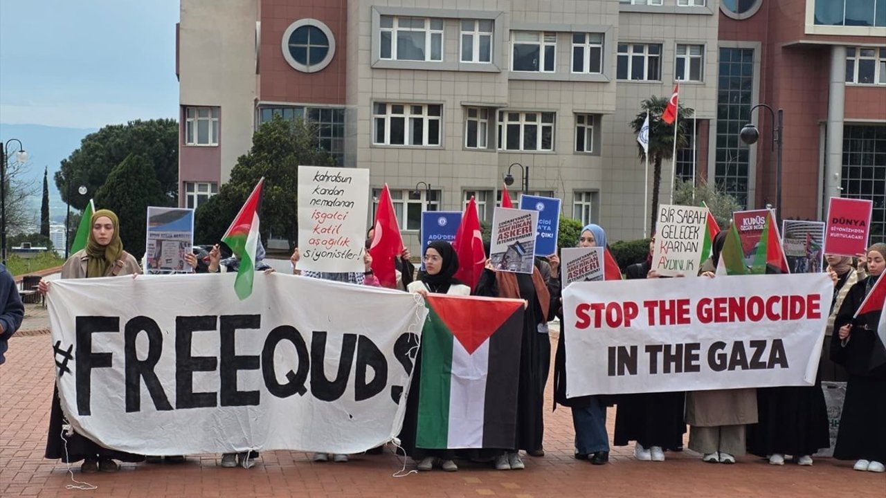 ADÜ'nün merkez kampüsünde toplanan öğrenciler, 'Mescid-i Aksa onurumuzdur' ve 'Filistin özgür olana dek mücadele sürecek' yazılı pankart açtı.