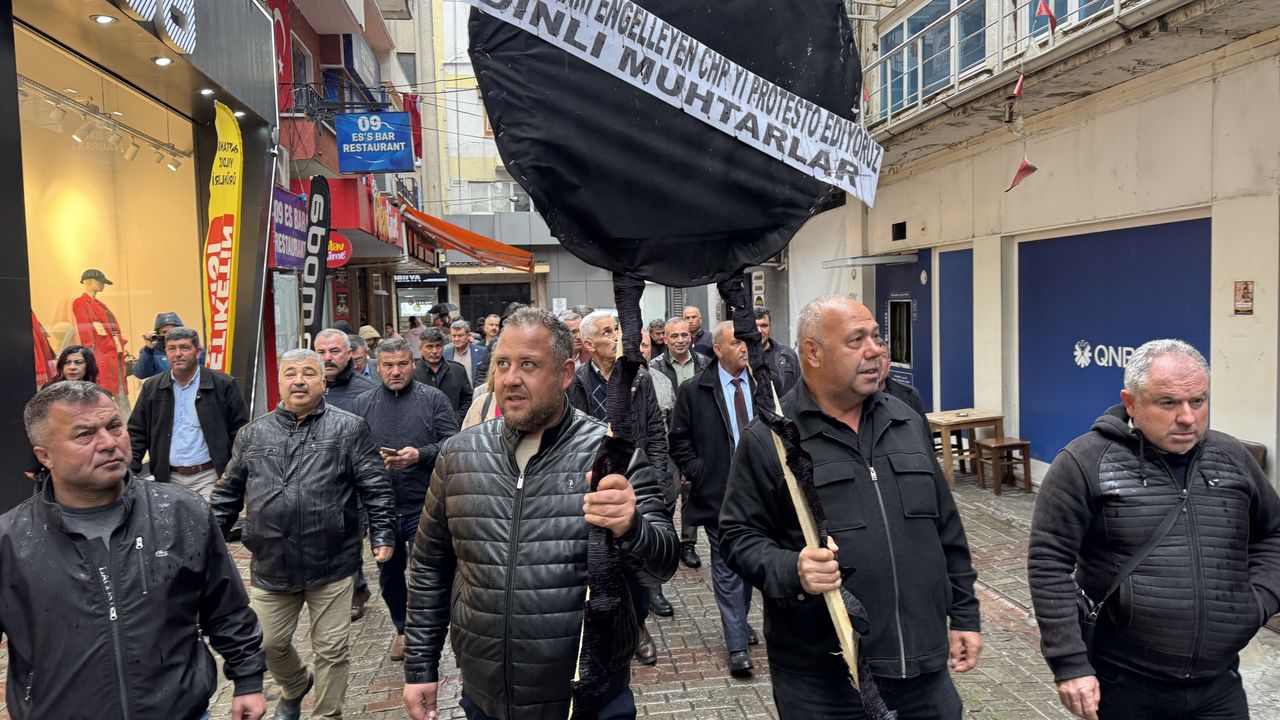 Yaklaşık 50 muhtar, 'Aydın'da yatırımı engelleyen CHP'yi protesto ediyoruz. Aydınlı muhtarlar' yazılı siyah çelenkle CHP İl Başkanlığı önüne geldi.