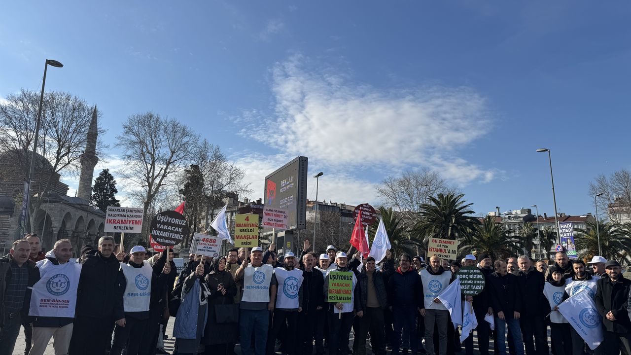 Aksaray Meydanı'nda toplanan ve ellerinde 'Üşüyoruz, ikramiyelerimiz kesilmesin' yazılı pankart taşıyan sendika üyeleri, slogan atarak İBB'yi protesto etti.