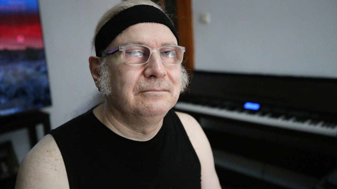 Evinin bir köşesindeki dijital piyanonun başına geçen Öztürk, uzun saçları ve kulağındaki küpesiyle kendine özgü tarzını yansıtarak şarkılarını seslendiriyor.