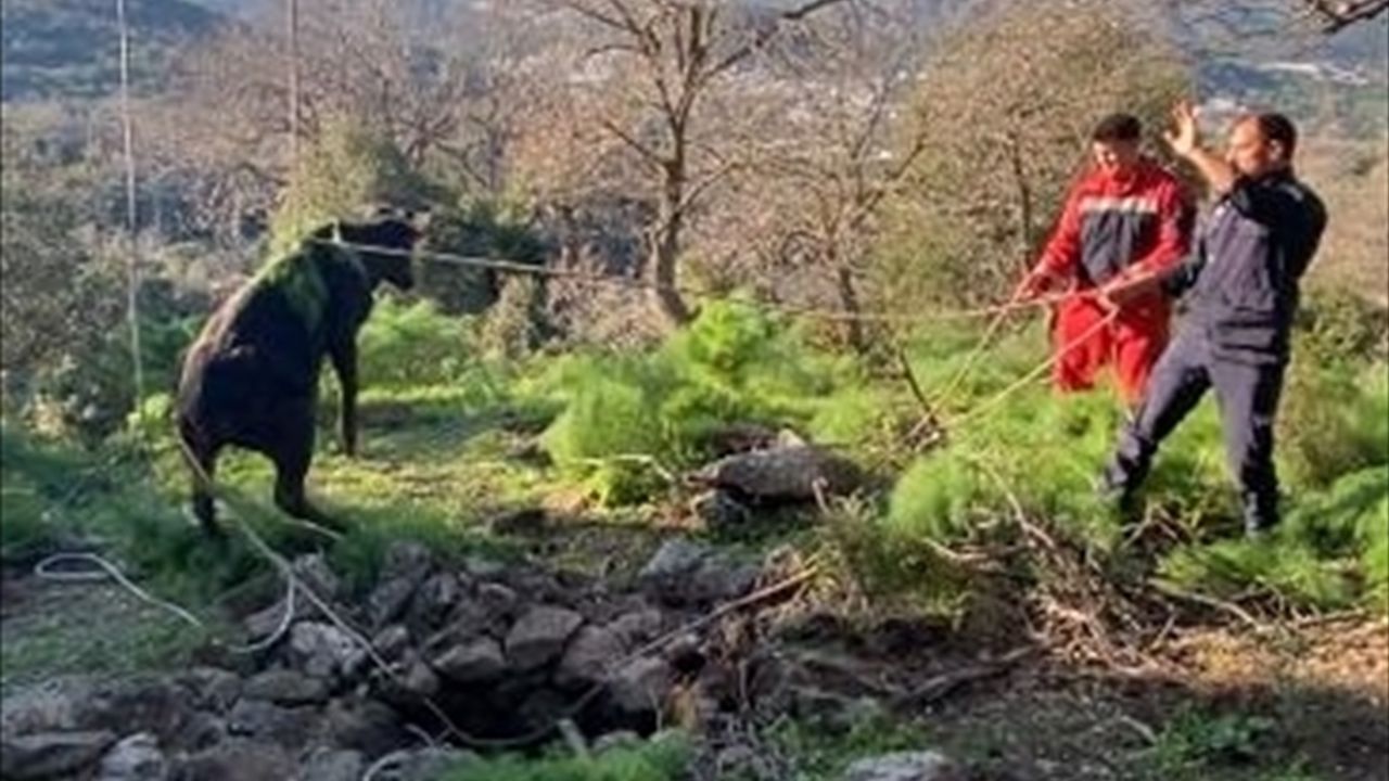 Akyarlar Mahallesi'nde bir buzağının kuyuya düştüğü ihbarını alan Muğla Büyükşehir Belediyesi Bodrum İtfaiye Grup Amirliği ekipleri bölgeye gitti.