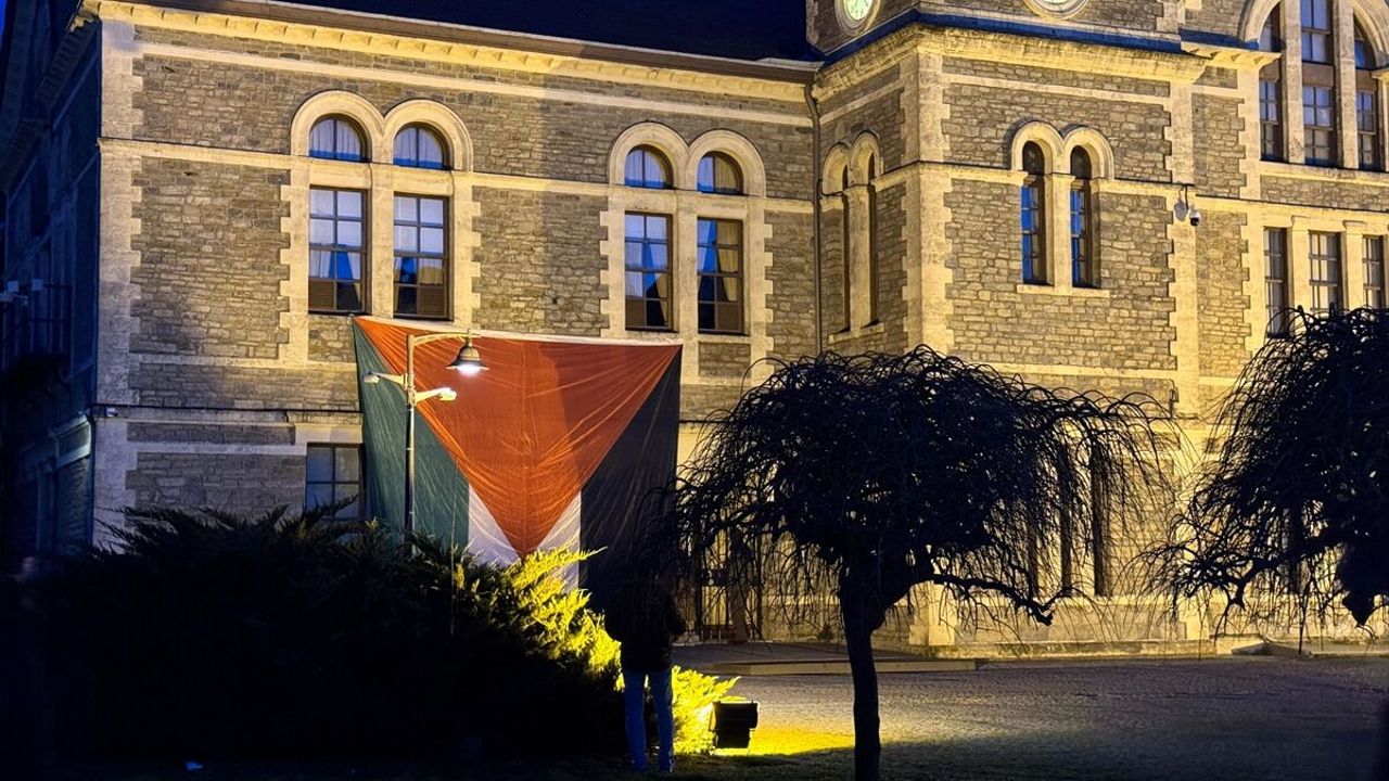 Yoğun katılımla gerçekleştirilen programda, Gazze'de yaşanan gelişmelere dikkati çekmek amacıyla rektörlük binasına Filistin bayrağı asıldı.