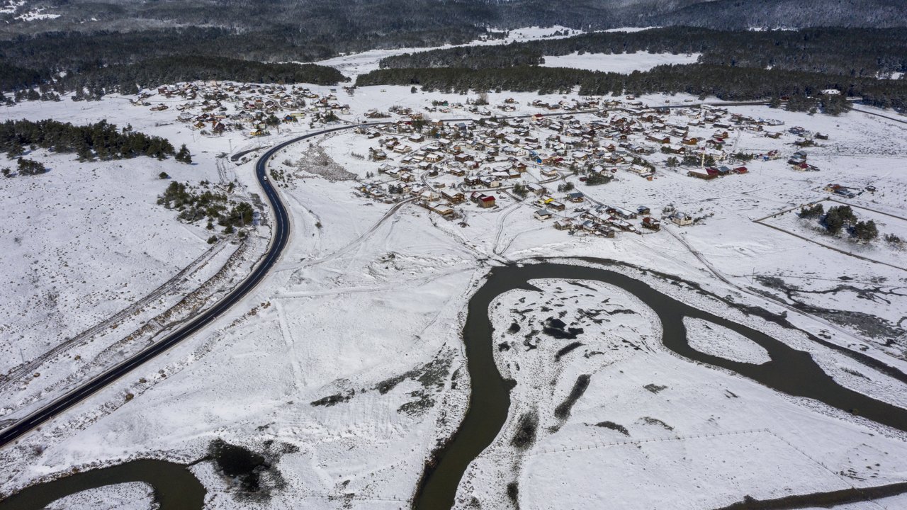 Bu arada, beyaz örtüyle kaplanan yayla ile menderesler havadan görüntülendi.