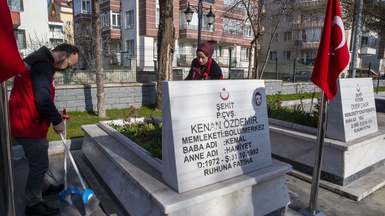 Şehitlikte çevre düzenlemesi ve temizlik yapan ekipler, mezarlardaki kuru ot ve yaprakları topladı.