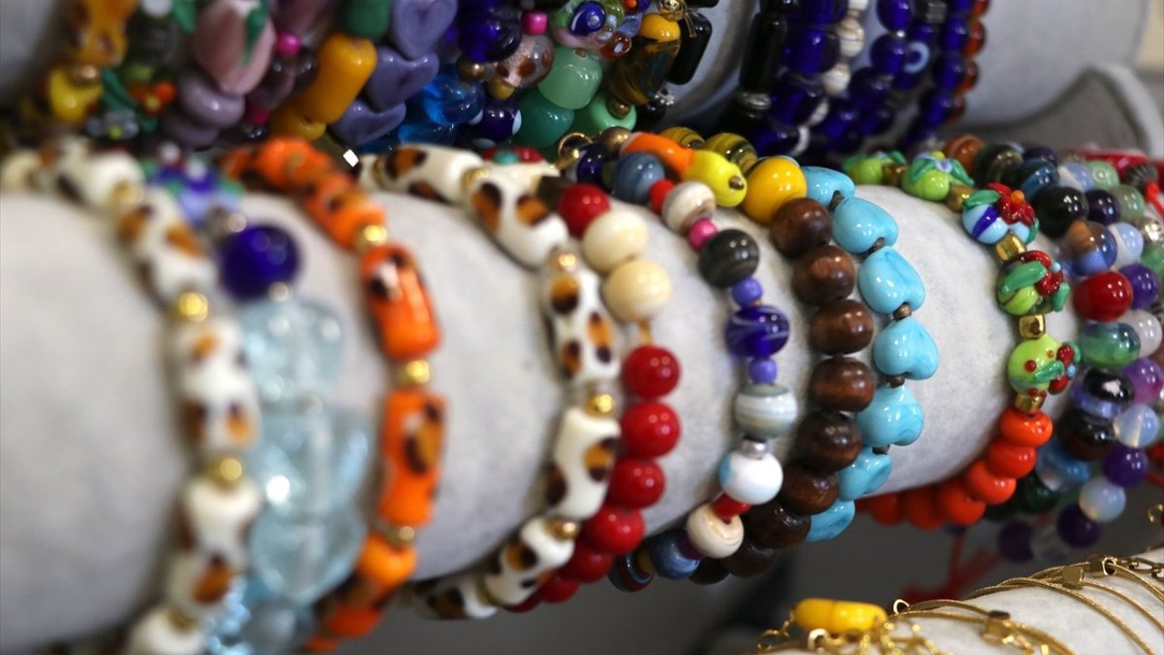 İstanbul'dan temin ettiği camları yüksek ısıda eriterek boncuklara dönüştüren Kazak, bileklikten kolyeye, anahtarlıktan dekoratif objelere kadar birçok ürün tasarlıyor.