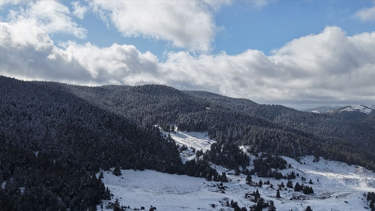 Ormanlık alanların karla buluşması dron ile görüntülendi.