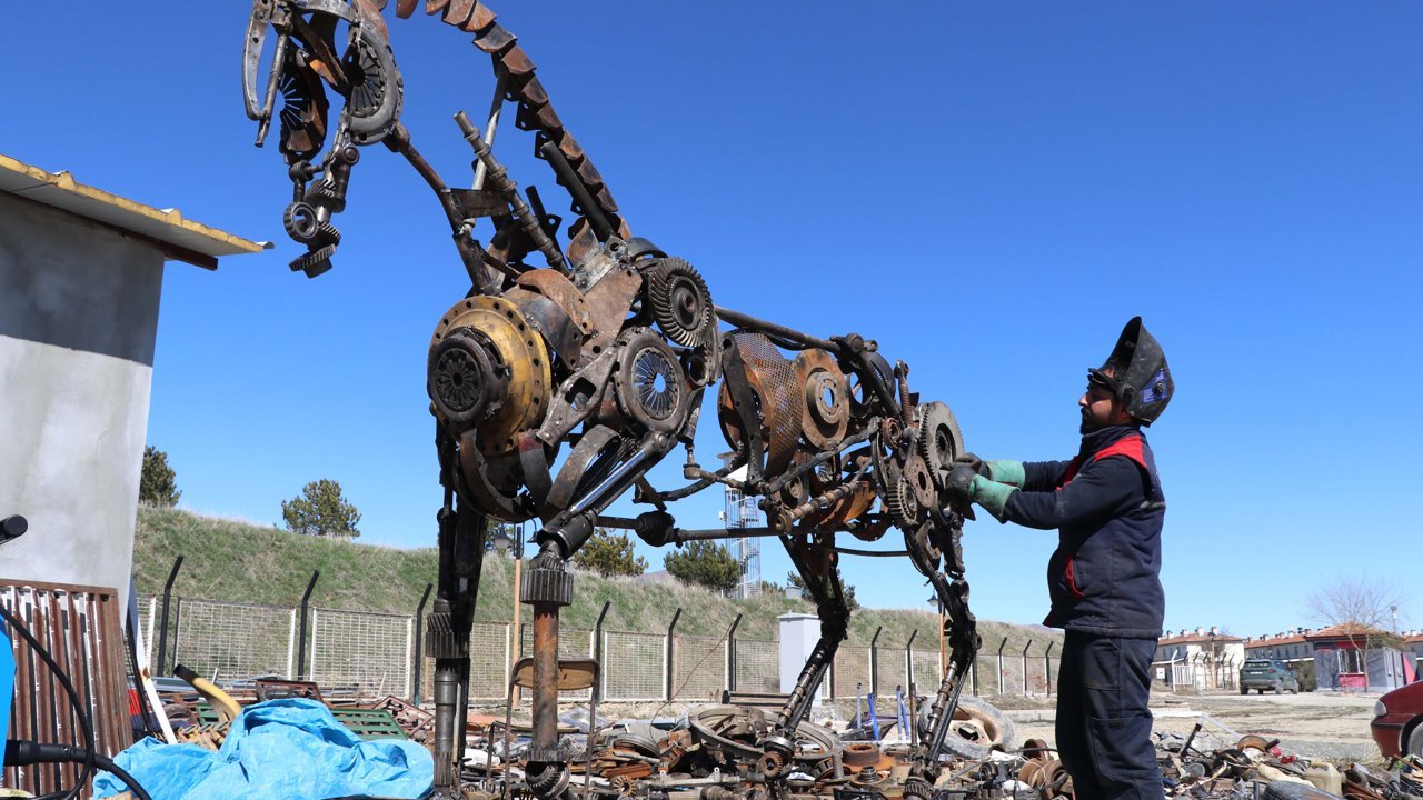 'Bu çalışmalarla geri dönüşüme katkı sağlarken ileri dönüşüm mantığıyla hareket ediyoruz. Kullandığımız malzemeler genellikle endüstriyel atıklardan oluşuyor. Heykellerin büyüklüğüne göre yapım süresi değişiyor. At heykellerini anatomik yapısına uygun şekilde uyarlamaya çalışıyoruz. Gaz altı kaynağı ve spiral taşıyla çalışıyorum. Heykellerin dengesini sağlamak için iç iskelet yapısını buna göre oluşturuyoruz.'