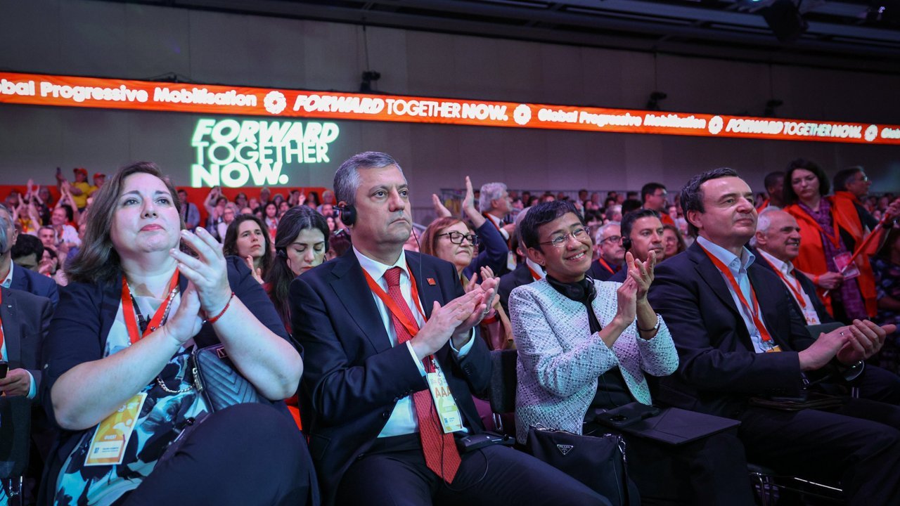 'Türkiye'de de son yerel seçimlerde biz bunu başardık. 47 yıl sonra partimizi Türkiye'nin birinci partisi yaptık. Türkiye nüfusunun yüzde 65'ini partimize ait sosyal demokrat belediye başkanları yönetiyor. Ancak sonrasında çok ağır bir saldırıya uğradık. İstanbul'un seçilmiş belediye başkanını, 15,5 milyon yurttaşımızın ön seçimle belirlediği, Cumhurbaşkanı adayımız olarak seçtiği Ekrem İmamoğlu'nu hapse atarak bir sonraki iktidara bugünden darbe yapan anlayışa karşı bir yılı aşkın süredir milyonlarla birlikte meydanlarda mücadele veriyoruz. Bir darbeye karşı halkın iradesini savunuyoruz.