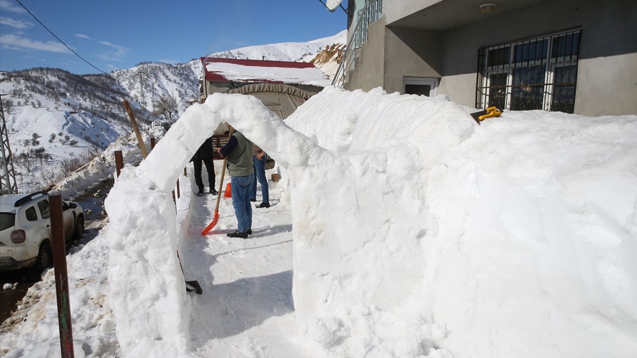 Kar kalınlığının 2 metreye ulaştığı köyde Bozdemir, 2 katlı evinin bahçesine kürek, mala ve çeşitli inşaat malzemeleriyle kardan oyun grubu oluşturdu.