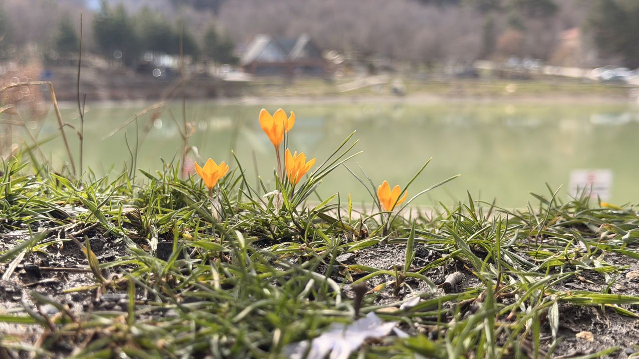 Halk arasında 'baharın müjdecisi' olarak bilinen sarı çiğdem ile mor menekşeler göl çevresinde güzel görüntüler oluşturdu.