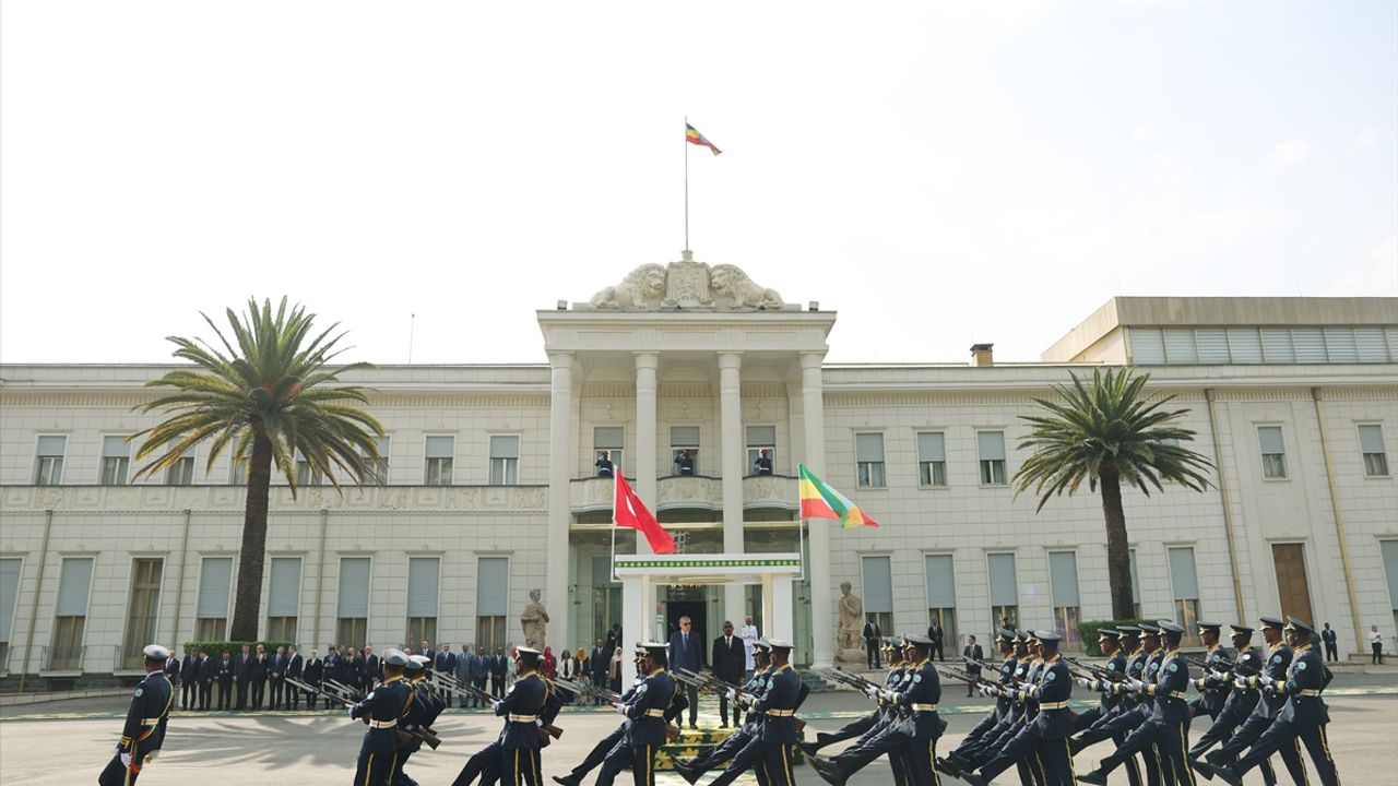 Cumhurbaşkanı Erdoğan'ı, Ulusal Saray'a gelişinde aracından inerken Etiyopya Başbakanı Ahmed karşıladı.