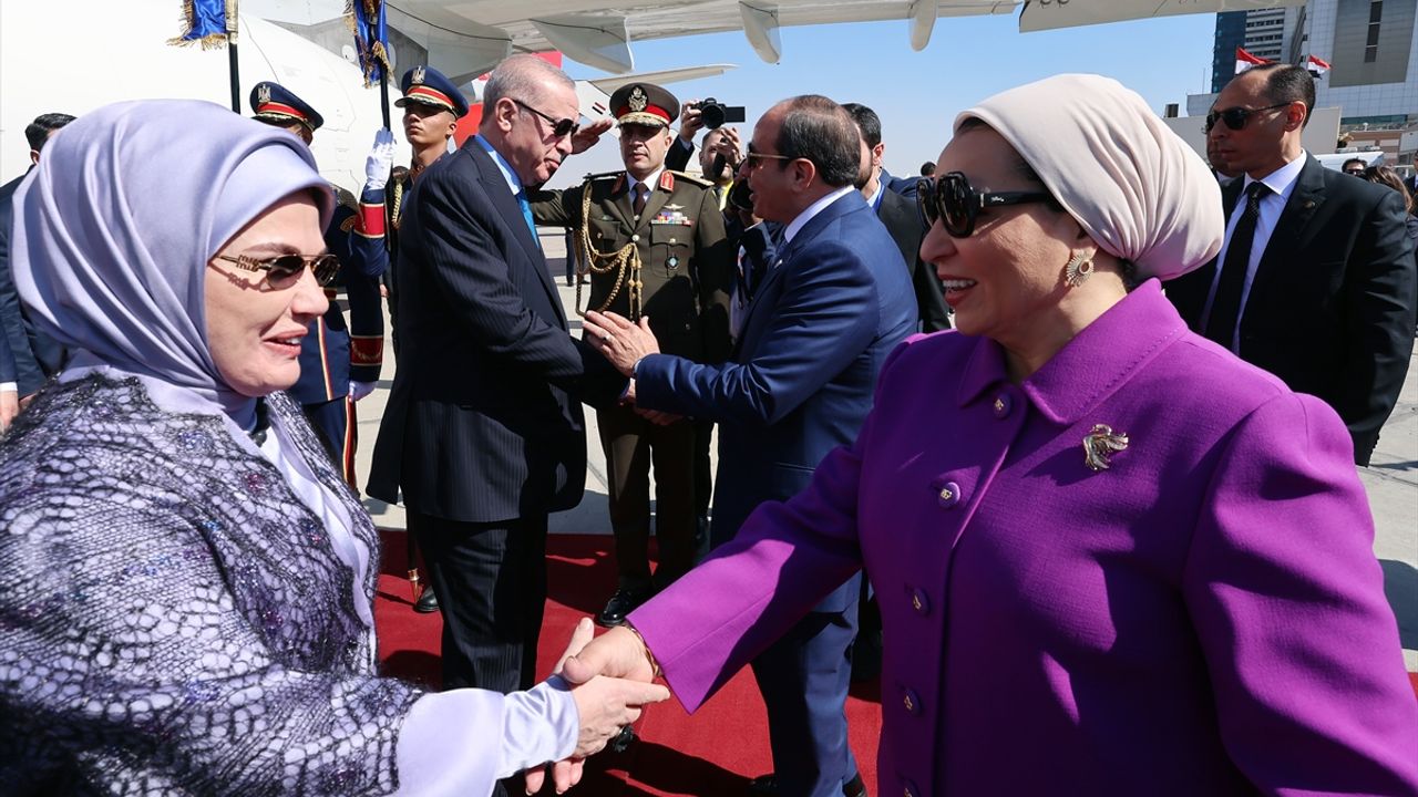 Erdoğan, Kahire Uluslararası Havalimanı'nda, Mısır Cumhurbaşkanı Abdulfettah es-Sisi ve eşi Entissar Amer ile Türkiye'nin Kahire Büyükelçisi Salih Mutlu Şen tarafından karşılandı.