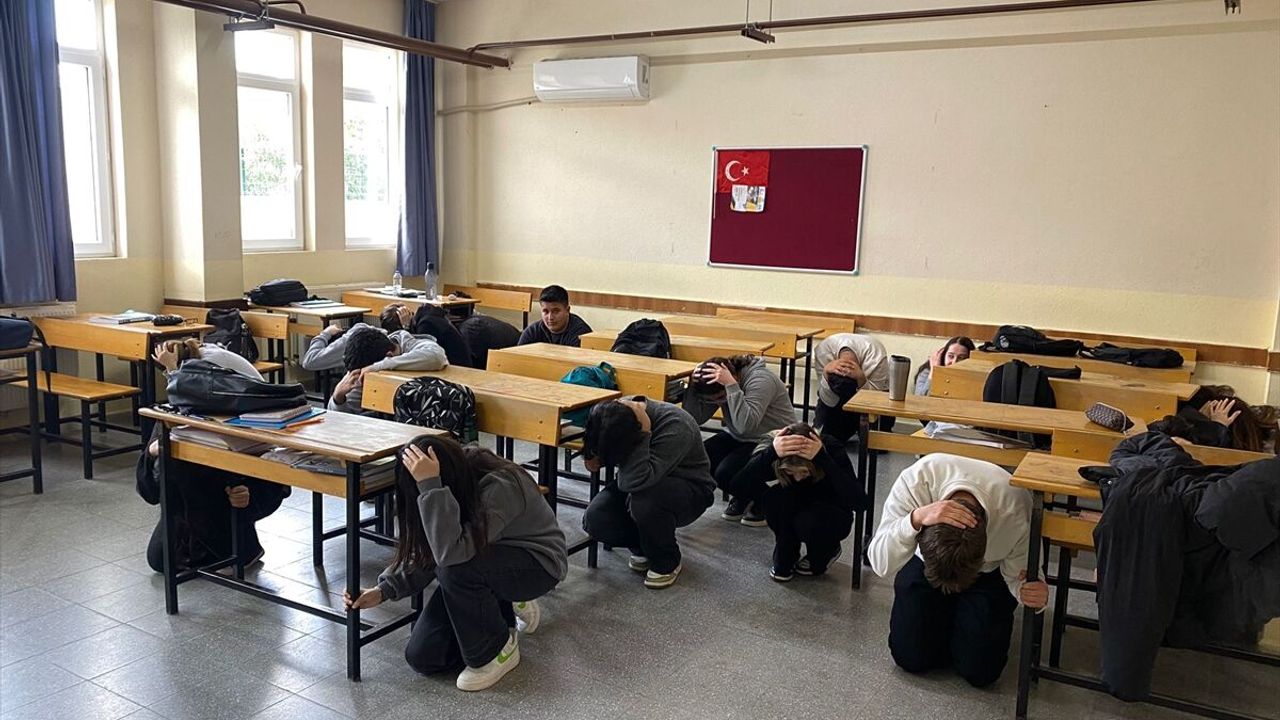 Tatbikat öncesinde sınıflarda öğrencilere deprem anında doğru davranış biçimleri hakkında bilgilendirme yapıldı.