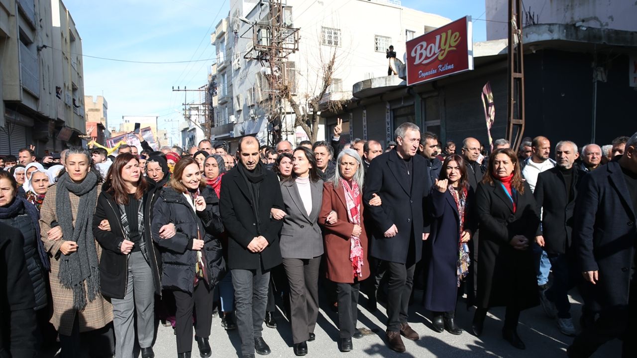 Hatimoğulları ve Bakırhan ile DBP Eş Genel Başkanı Keskin Bayındır, DEM Parti Sözcüsü Ayşegül Doğan, Diyarbakır Büyükşehir Belediye Başkanı Ayşe Serra Bucak Küçük, bazı DEM Parti milletvekilleri, eski Mardin Büyükşehir Belediye Başkanı Ahmet Türk'ün aralarında bulunduğu grup, Selahattin Eyyübi Mahallesi'nden Kışla Mahallesi'ne yürüdü.