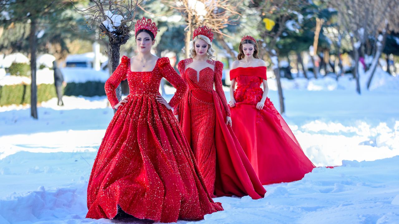 Defilede yeni tasarımlardan 6 beyaz gelinliği ve 3 kırmızı nişanlığı giyen mankenler, karla kaplı alanda yürüyerek yeni koleksiyonun bazı parçalarını tanıttı.
