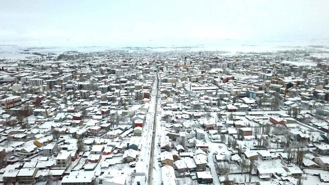 Kar yağışıyla beyaza bürünen Ağrı kent merkezi ve çevresindeki dağlar dronla görüntülendi.