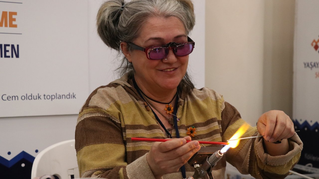 Doktorunun tavsiyesiyle cam sanatına başladığını anlatan Dikmen, 'Oğlumu yetiştirdim. 8 yaşında başladı ve şu an Türkiye'nin en genç cam sanatçısı. Odun Pazarı Cam Müzesi'nde 6 eseri sergileniyor.' diye konuştu.