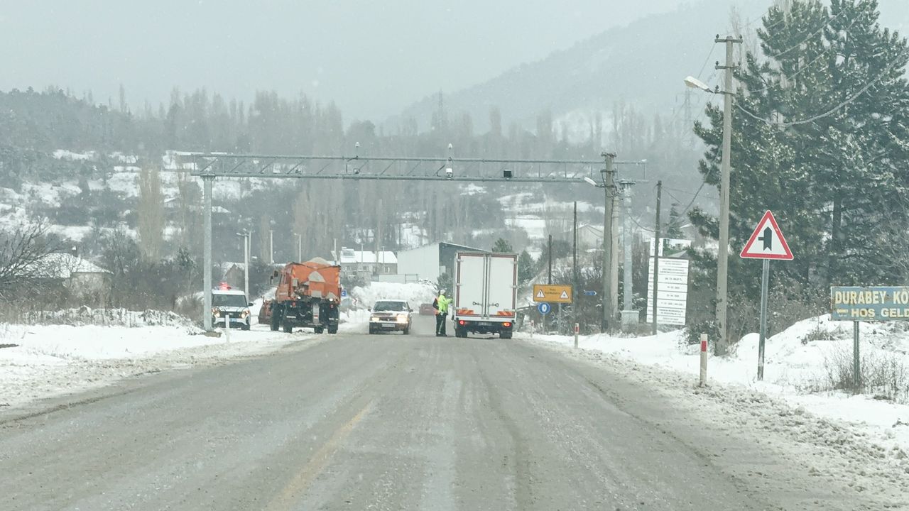 Domaniç Dağları'ndaki kar yağışı nedeniyle ağır tonajlı araçların bölgeye geçişine izin vermeyen ekipler, diğer araçların sürücülerine de uyarıda bulundu.