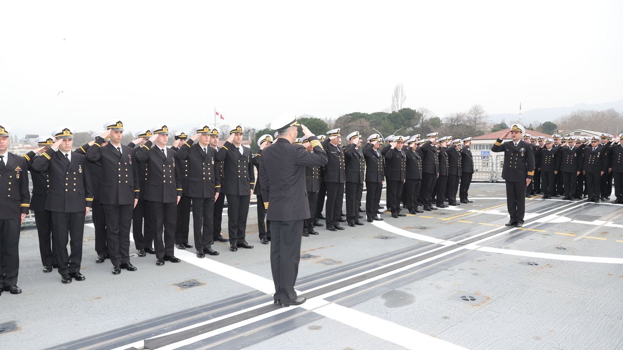Türk donanmasının en önemli unsurları arasında yer alan TCG Barbaros'ta, Başçarkçı tarafından, gemi personelinin bayramlaşma töreni için helikopter platformunda hazır olduğu, Gemi Komutanı Deniz Kurmay Albay Üstünay Çevik'e rapor edildi.