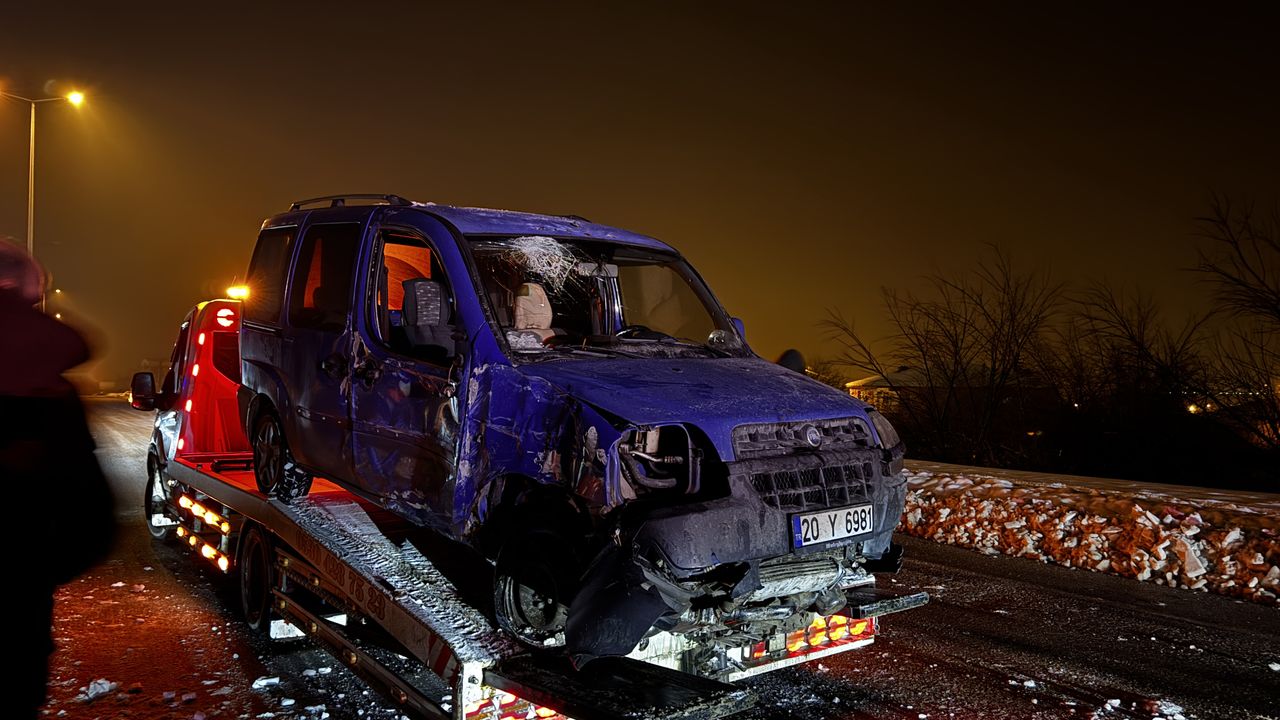 Yurtbaşı beldesi yolunda sürücüsünün kimliği henüz öğrenilemeyen 20 Y 6981 plakalı hafif ticari araç, buzlanmanın etkili olduğu yolda refüjdeki aydınlatma direğine çarptı.