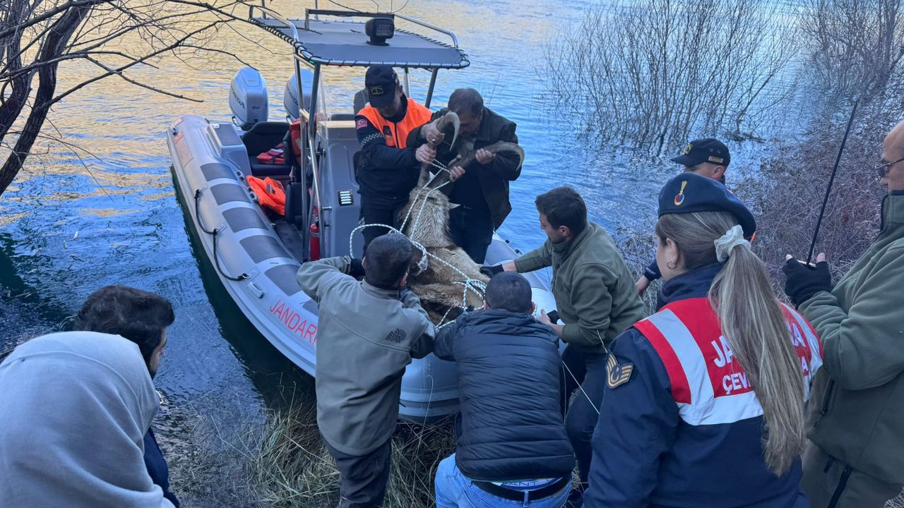 Ekipler tarafından bota alınan dağ keçisi kıyıya ulaştırıldı.