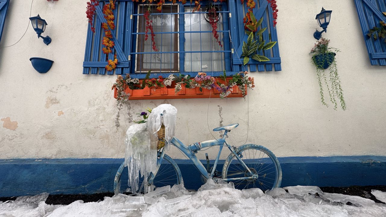 Yağışla sarıçam ormanları, park halindeki araçlar ile evler karla kaplandı, bina çatılarında buz sarkıtları oluştu.