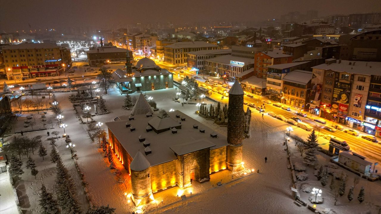 Tarihi Çifte Minareli Medrese, Erzurum Kalesi ve Yakutiye Medresesi ile çevresi, beyaz örtüyle kaplandı.