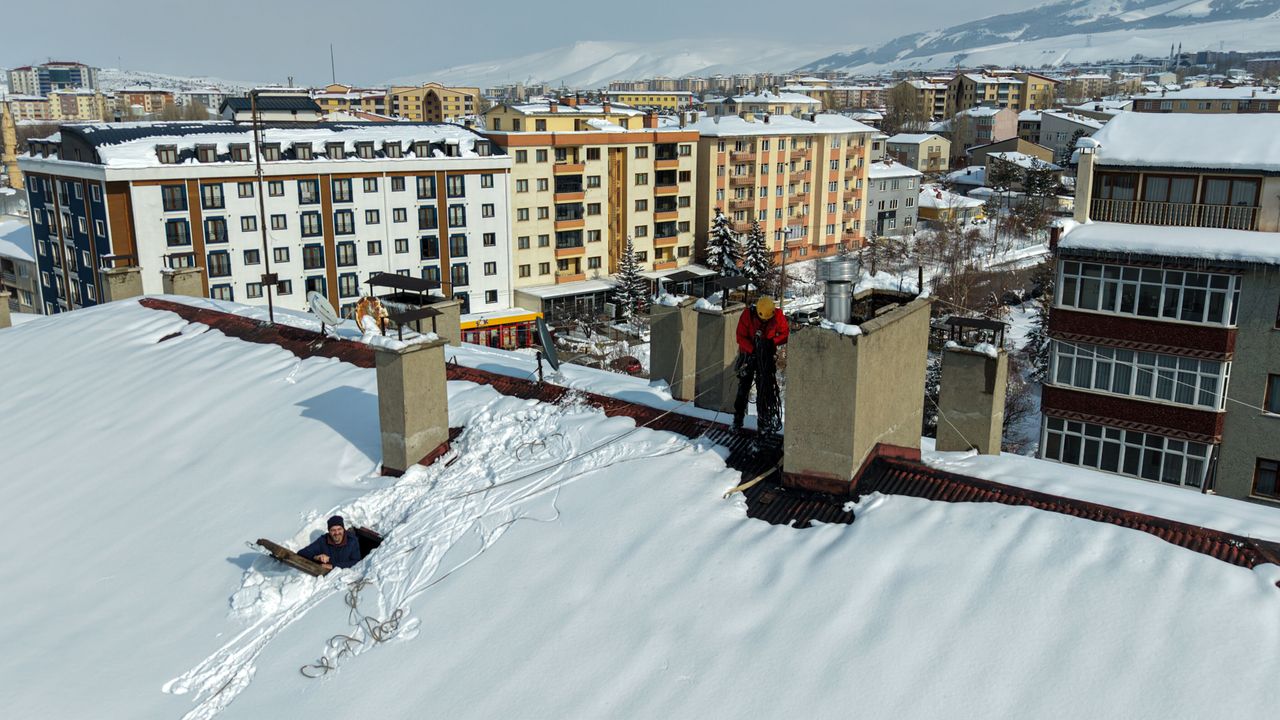 Şehirdeki bu riski ortadan kaldırmak üzere bir araya gelen 4 profesyonel dağcı, 'buz timi' kurdu. Dağcılık ekipmanlarıyla güvenliklerini sağlayan ekipler, bacalara sabitlenen hatlar üzerinden çatılara inerek biriken kar ve buzları kontrollü şekilde temizliyor.