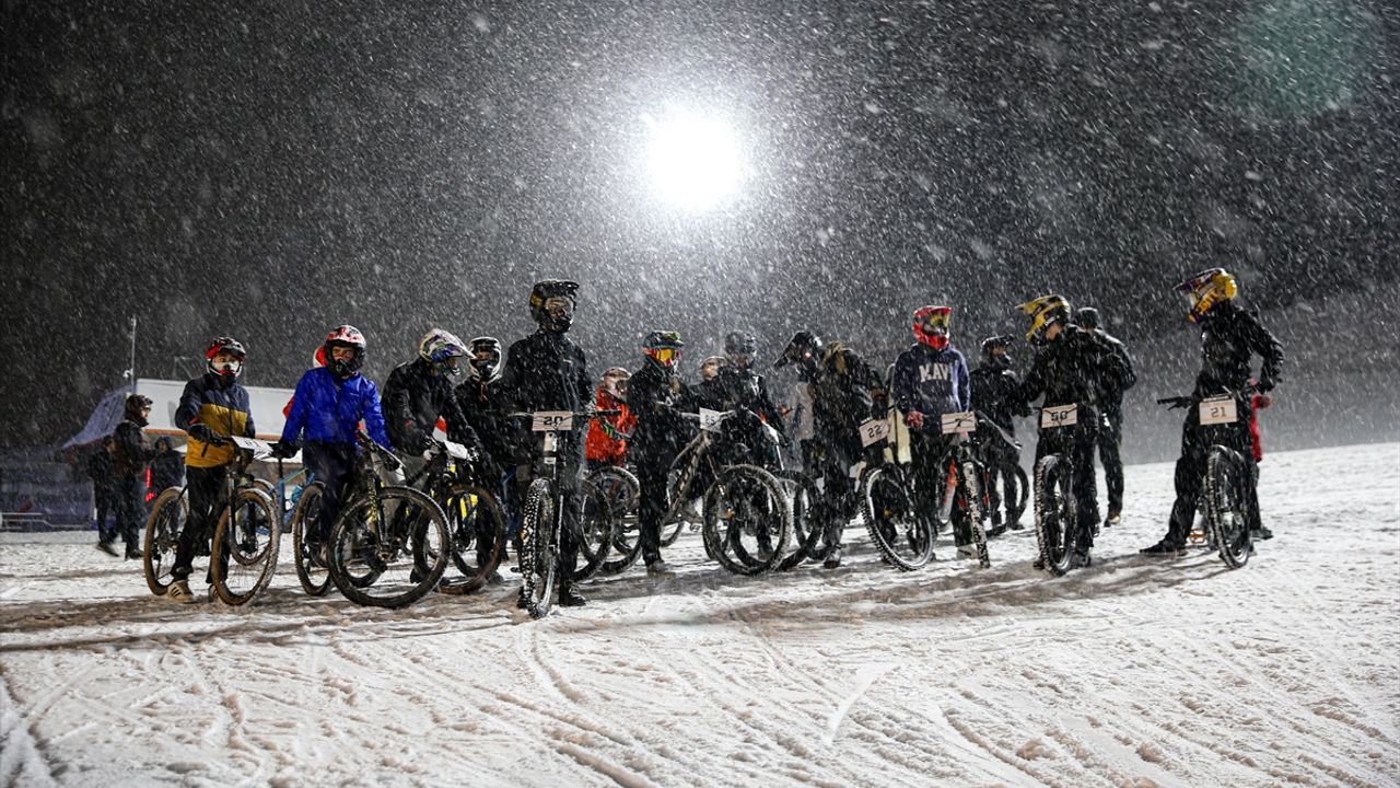 Sporcular, bin 200 metre uzunluğundaki kar üzerinde bisikletle yarışacakları şampiyona öncesinde, parkuru tanıdı.