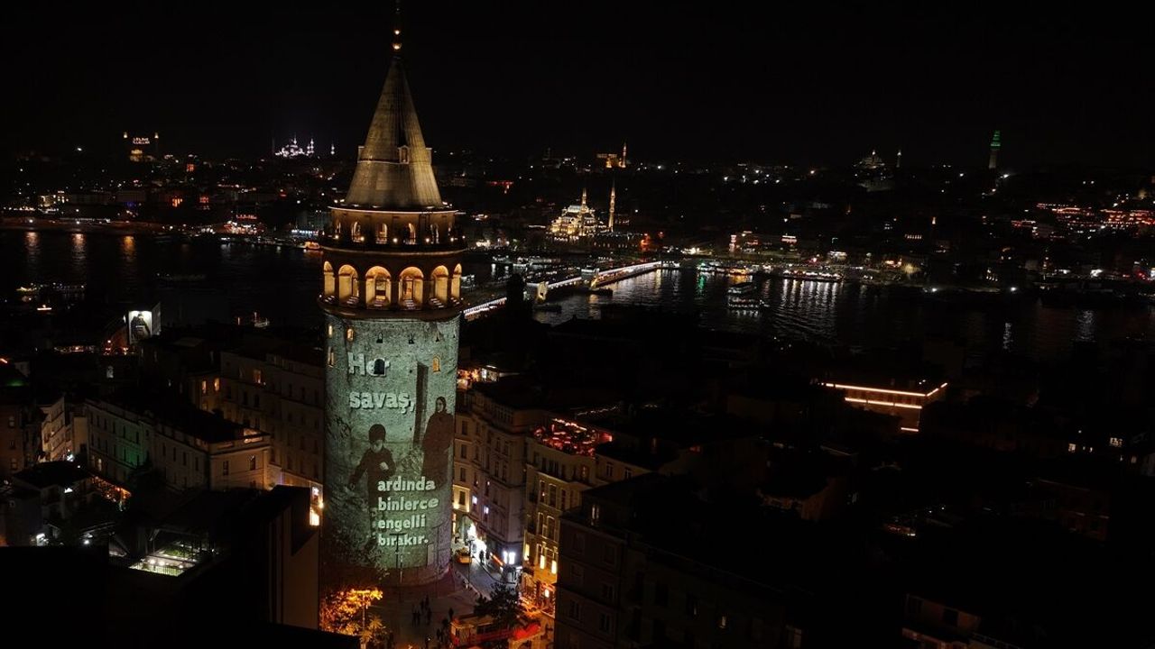 İSTANBUL (AA) - Türkiye Beyazay Derneğince 3 Aralık Dünya Engelliler Günü kapsamında Galata Kulesi'ne, savaşlar sonrasında engelli kalan çocukların ve sivillerin anlatıldığı video yansıtıldı.