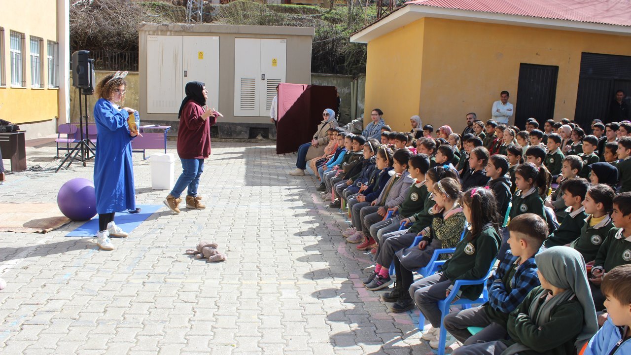 İlk izleyicileri olan öğrencilere hediyeler de veren grup üyeleri, ilk kez tiyatro izlemenin heyecanını yaşayan çocuklara güzel bir gün yaşattı.