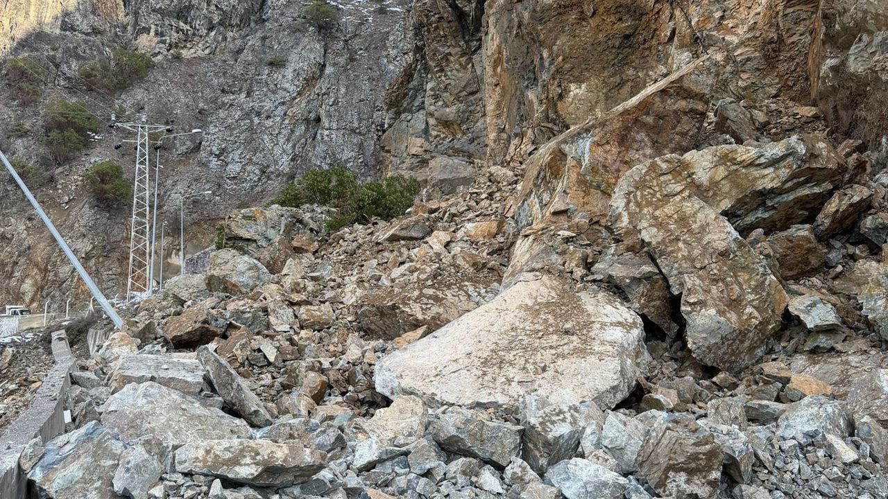 Gümüşhane'nin Kürtün ilçesine bağlı Özkürtün beldesindeki tünelin giriş kısmına yamaçtan kopan kaya parçaları ve toprak birikintisi sürüklendi.