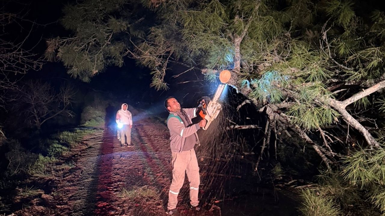 Milas'ın Avşar Mahallesi'nde iki ağacın devrilmesi sonucu yol kapandı. Devrilen ağaçların elektrik tellerini koparması nedeniyle bölgede enerji kesintisi yaşandı. Olay yerine sevk edilen ekipler, çalışma başlattı.