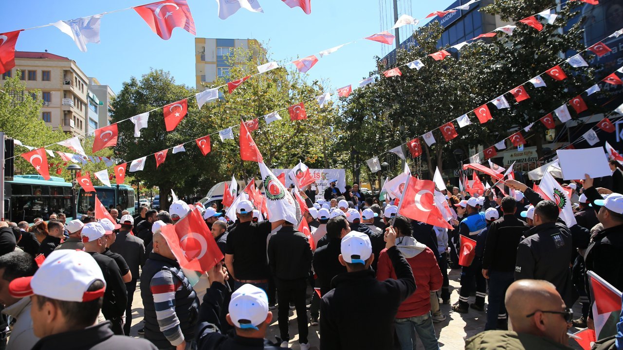 Program öncesi meydanda toplanan sendika üyeleri ellerinde Türk ve Filistin bayraklarıyla 'Gazze'ye selam direnişe devam', 'Yaşasın 1 Mayıs', 'Eşit iş eşit ücret' yazılı dövizler taşıdı.