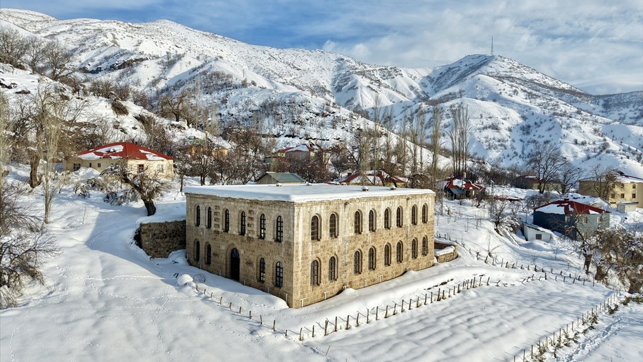 HAKKARİ (AA) - Hakkari'nin Şemdinli ilçesinde etkili olan kar yağışıyla beyaza bürünen tarihi yapılar dronla kaydedildi.