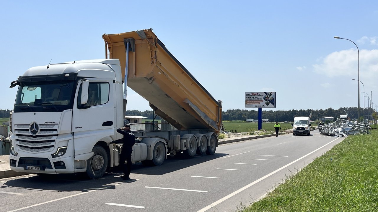 HATAY (AA) - Hatay'ın Kırıkhan ilçesinde damperi açık şekilde ilerleyen kamyon, Elektronik Denetleme Sistemi (EDS) direğine çarptı.