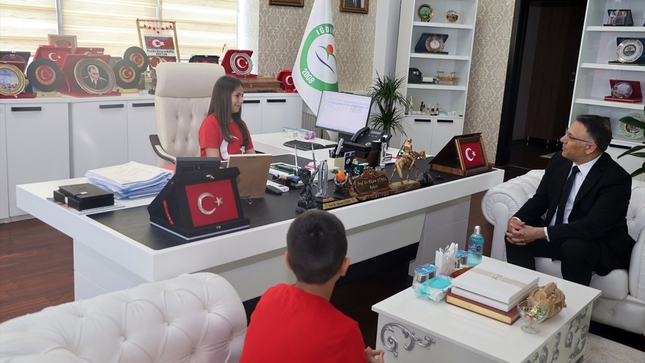 Kentteki 23 Nisan kutlamaları kapsamında Iğdır Üniversitesine gelen Melekli Atatürk İlkokulu öğrencilerinden Defne Miray Çatalkaya rektörlük koltuğuna, Poyraz Varol ise rektör yardımcılığı koltuğuna oturdu.