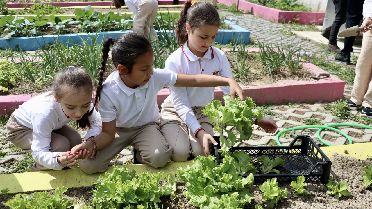 Öğrenciler ayrıca okul bahçesinde oluşturulan alanda yetiştirdikleri ürünlerin hasadını da gerçekleştiriyor.
