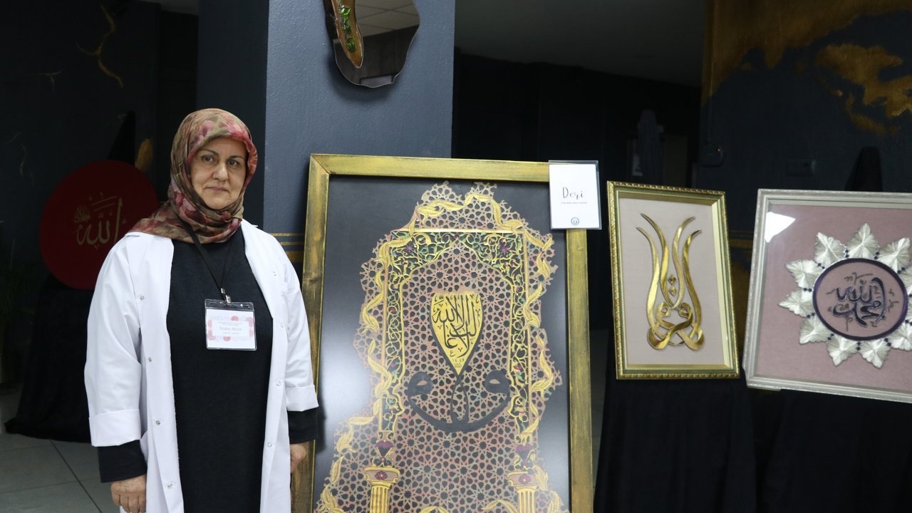 Kurumun açtığı sergi için oğlak derisine katı, tezhip ve hat sanatını ekleyerek oluşturduğu tablo eserini 3 ayda tamamladığını anlatan Akyüz, o süreçte ders saati dışında öğrencileri gittikten sonra 1-2 saat atölyede çalıştığını ya da evde devam ettiğini kaydetti.