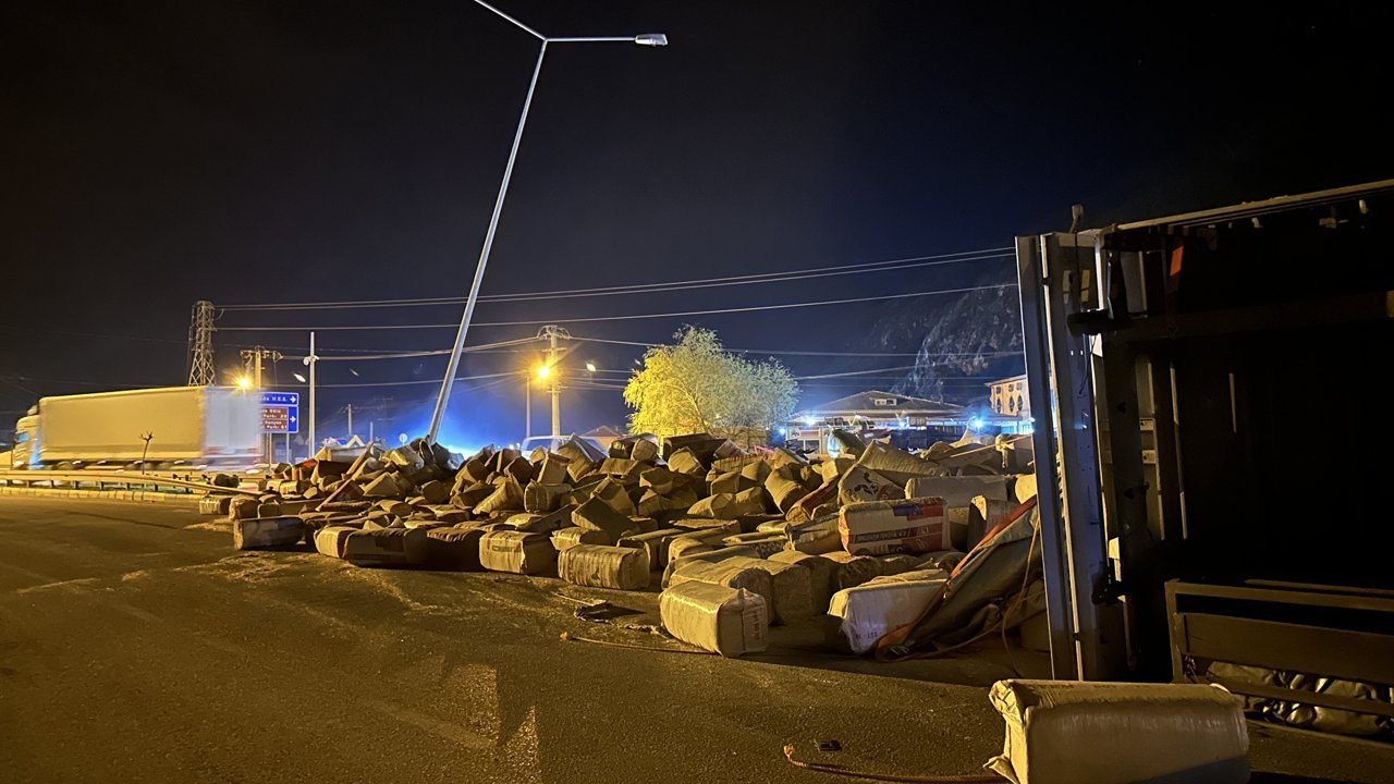 Konya istikametinden Isparta yönüne seyir halinde olan 02 ACY 895 plakalı saman yüklü tır, Köprübaşı mevkisinde devrildi.